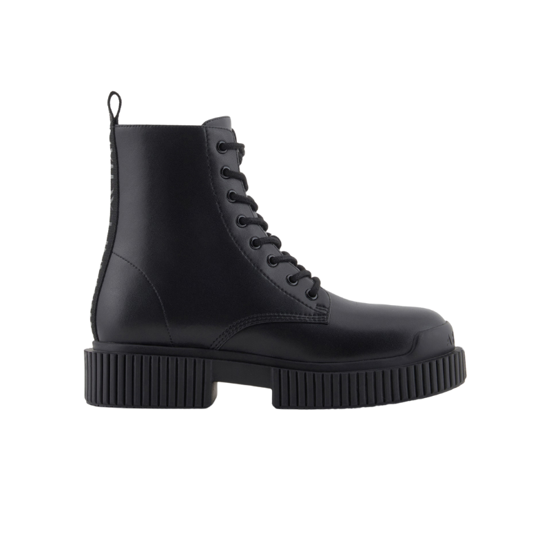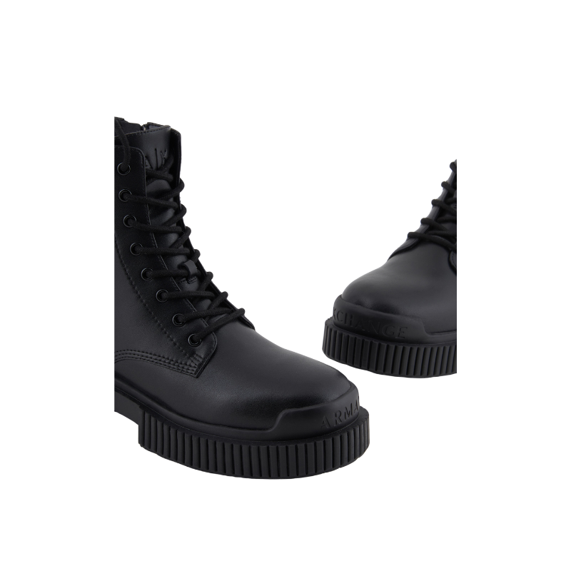 Anfibi in vera pelle nera di Armani Exchange, con chiusura a lacci e suola in gomma. Design contemporaneo per un look grintoso e alla moda.