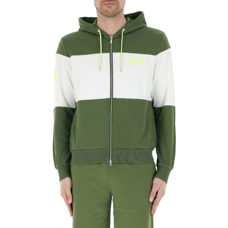 La felpa SUN68 modello F34120 è realizzata in morbido cotone, offrendo comfort e stile per le tue giornate casual. Dotata di cappuccio regolabile tramite coulisse e chiusura con zip a doppio cursore, presenta polsini e fondo capo lavorati a costine per una vestibilità ottimale. Il logo fluo ricamato sul petto e sulla manica aggiunge un tocco distintivo al design. Disponibile in vari colori, è perfetta per completare il tuo outfit quotidiano con un tocco di vivacità.