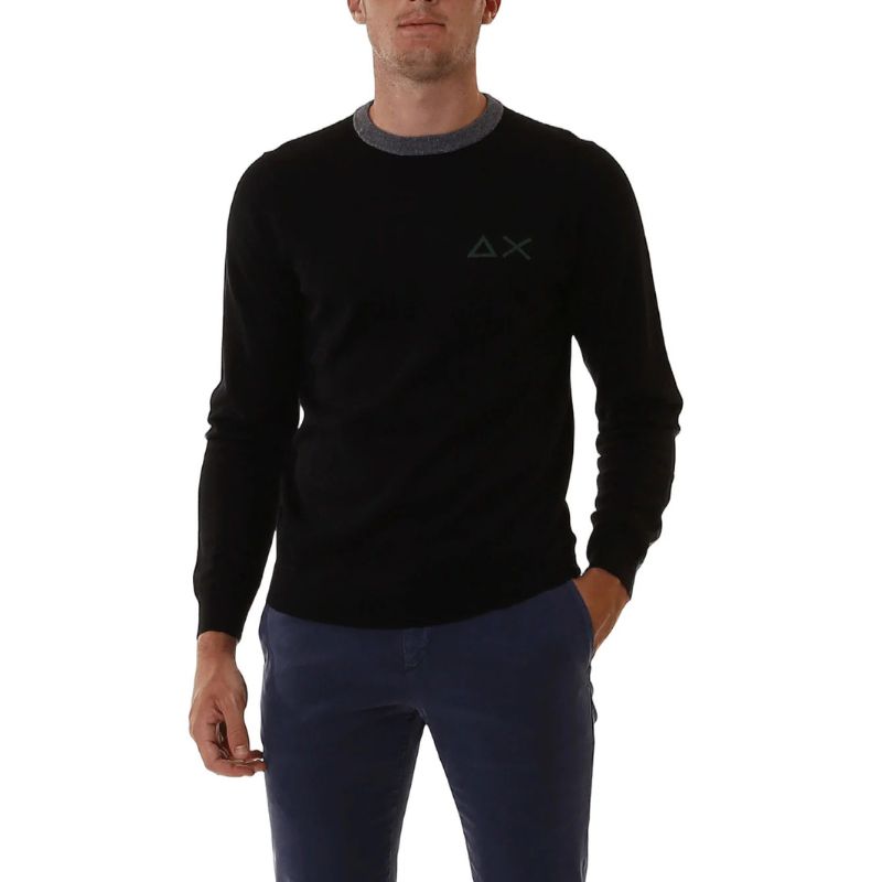 Maglione girocollo da uomo SUN68 modello K43113, realizzato in misto lana e cotone con logo prominente sul petto e dettagli a contrasto sui gomiti, ideale per un look casual e distintivo.
